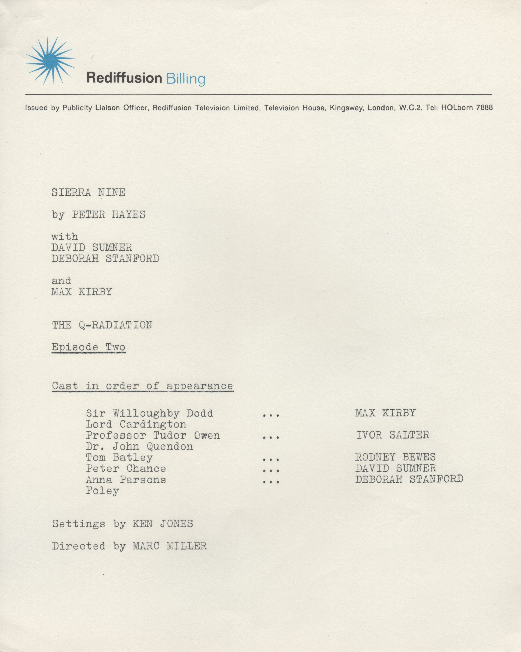 Rediffusion Billing — Sierra Nine — The Q-Radiation — Episode 2